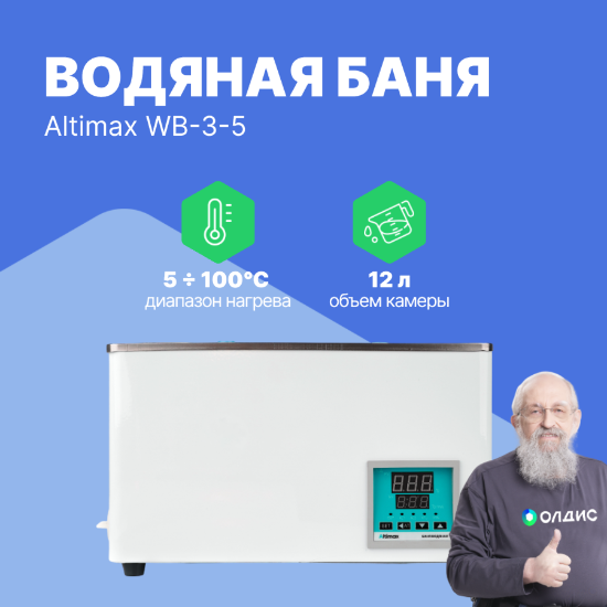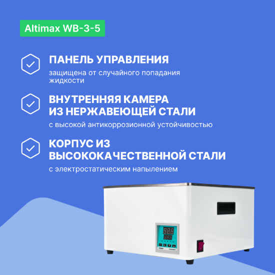 Водяная баня Altimax WB-3-5 предназначена для нагрева различных ёмкостей (колб, пробирок, стаканов и т. д.) в диапазоне температур от комнатной до 100 °C. Это устройство подходит для сушки, концентрирования, перегонки химических веществ, проведения и подготовки химических реакций, термостатирования и инкубации. Водяные бани Altimax используются в медицине, биологии, биохимии, физической химии, химии, для анализа качества продукции и сырья, а также в других областях, где требуется термостатирование и нагрев в узком температурном диапазоне. Благодаря цифровому ПИД-регулятору, защите панели управления от случайного попадания жидкости и высокой точности нагрева, эти бани являются надёжным и эффективным инструментом для лабораторий и исследований. В бане предусмотрено 4 рабочих мест.
