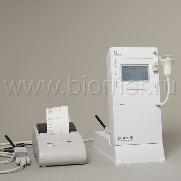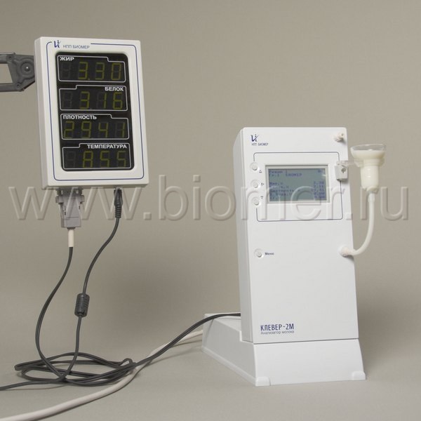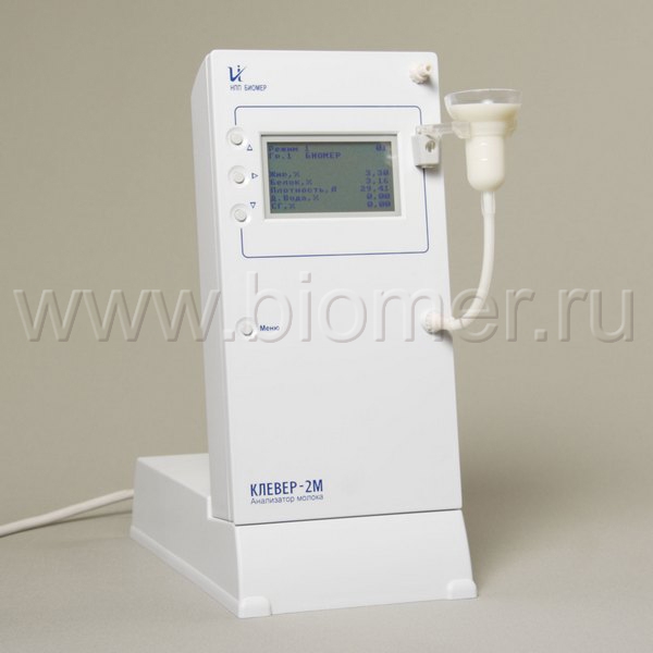 Анализатор молока Клевер-2М предназначен для измерения массовой доли жира, белка, лактозы, минеральных солей (золы) и плотности в молоке и молочных продуктах в соответствии с методикой выполнения измерений, аттестованной в установленном порядке. Дополнительно анализатор измеряет или рассчитывает на основании измеренных данных массовую долю сухого молочного остатка, обезжиренного молочного остатка, степень гомогенизации и точку замерзания молока, а также индицирует температуру пробы и рассчитанное количество добавленной воды.