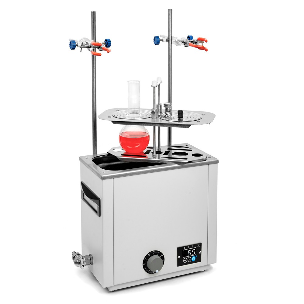 Универсальная баня ЛБ23‑Ш оснащена легко извлекаемой корзиной с подвижным дном для размещения лабораторной посуды различного размера, стальными концентрическими кольцами для ее уплотнения, штативами и лапками с зажимом.