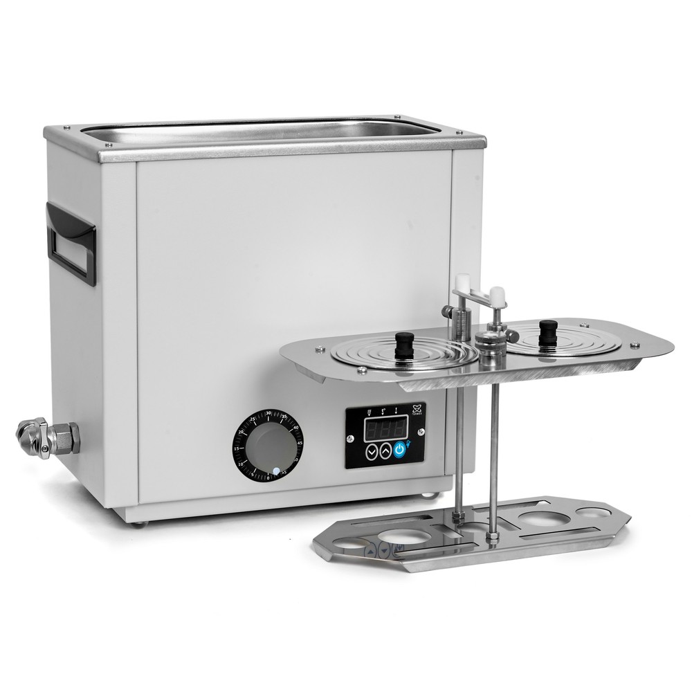 • Система из 5‑ти стальных концентрических колец позволяет уплотнять размещенные в ванне колбы, стаканы и другую лабораторную посуду.
