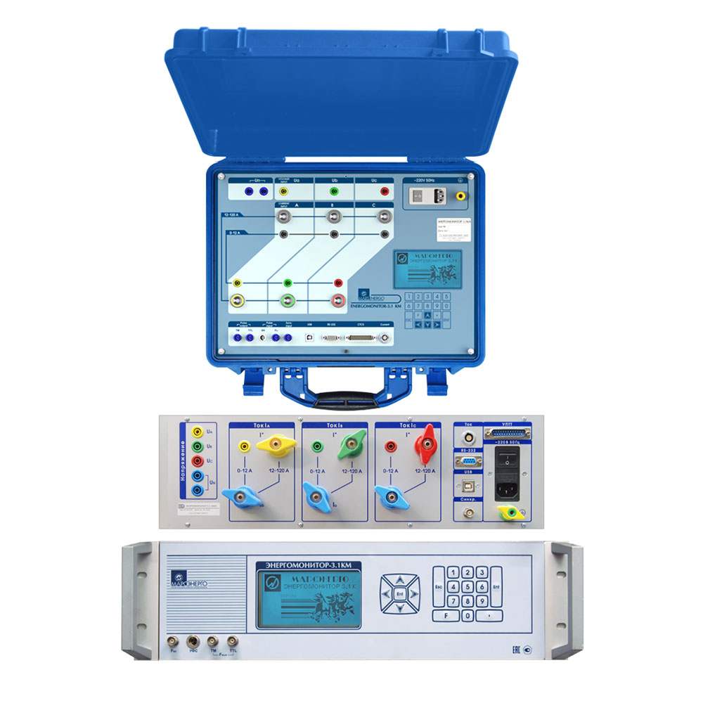 Прибор Энергомонитор 3.1КМ-П-02 (эталонный счётчик) поставляется в переносном исполнении и предназначен для калибровки и поверки эталонов 2-го разряда и рабочих средств измерений электроэнергетических величин: