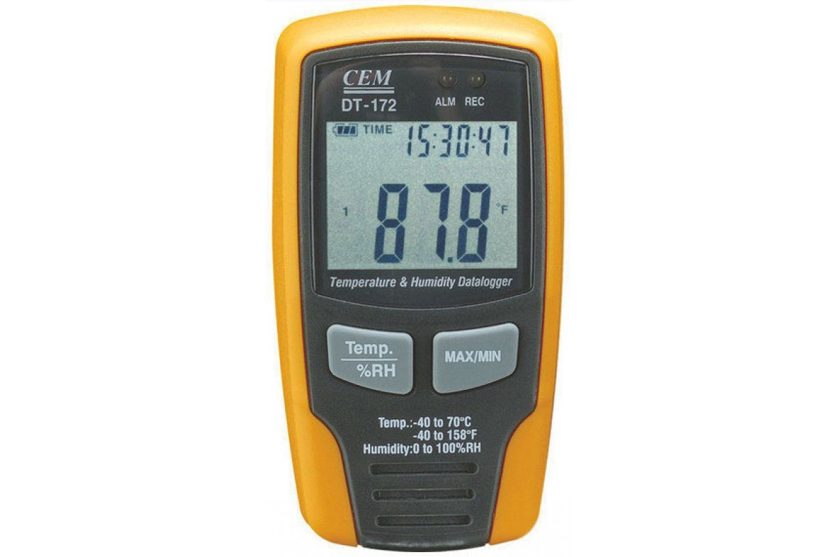 Портативный регистратор CEM DT-172 предназначен для измерения, регистрации и мониторинга температуры и влажности окружающей среды. Прибор обладает широким диапазоном измерения: от 0% до 100% Rh и от -40оС до +70оС, что позволяет использовать его не только в жилых и производственных помещениях, но и в морозильных камерах и т.п. Данные записываются на блок памяти, рассчитанный на 16350 значений, и одновременно выводятся на ЖК-дисплей. Логгер CEM DT-172 производит измерения с высокой степенью точности: погрешность не превышает ± 3,0-5,0 % Rh и ±1-2оС. Продолжительность цикла измерения можно варьировать от 1 секунды до 24 часов.