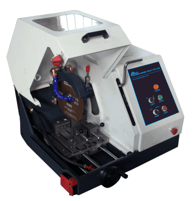 Просторная камера отрезного станка оснащена яркой подсветкой и позволяет за несколько секунд сменить отрезной диск/ Универсальный Т-образный столик с богатым набором зажимов позволяет работать с образцами любых форм. Благодаря подаче столика существенно увеличена глубина и точность реза. Система циркуляционного охлаждения образца имеет две настраиваемые форсунки, фильтр охлаждающей жидкости.