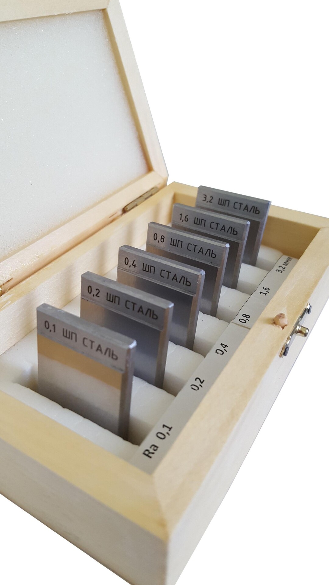 Образцы изготавливаются с различными номинальными значениями параметра шероховатости Ra, выбранными из ряда номинальных значений, допускается дополнительно оценивать поверхность образцов параметрами шероховатости Rz, Rmax, Sm, S и др., значения которых не нормируются и приводятся как справочные по результатам измерений. Также можно заказать комплект из 6 шт, состоящий не из образцов с различными номинальными значениями параметра шероховатости Ra, а комплект только с одним или двумя номинальными значениями параметра шероховатости Ra, например: 0,1; 0,2; 0,3 и далее по выбору заказчика.