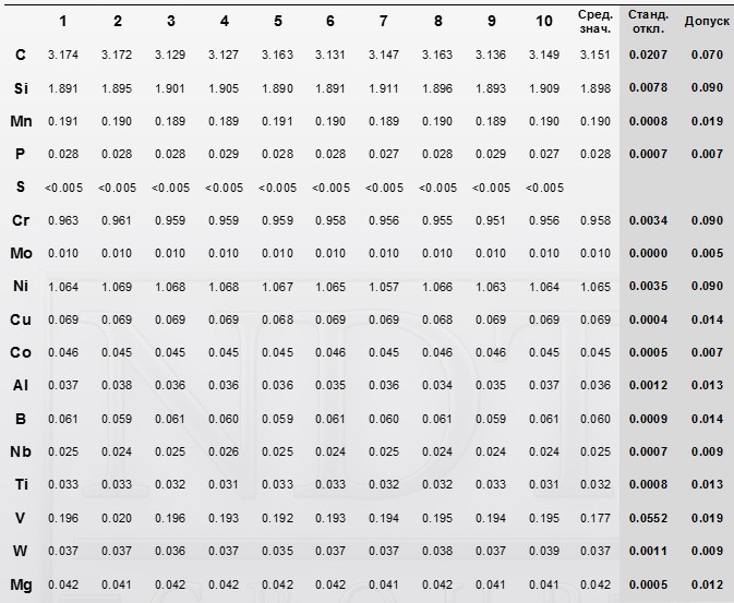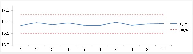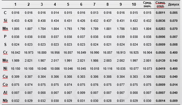 Ниже приведены примеры параллельных измерений образцов нержавеющей стали и чугуна. В качестве допуска указаны значения в соответствие с нормативами контроля внутрилабораторной воспроизводимости ГОСТ Р 54153-2010.