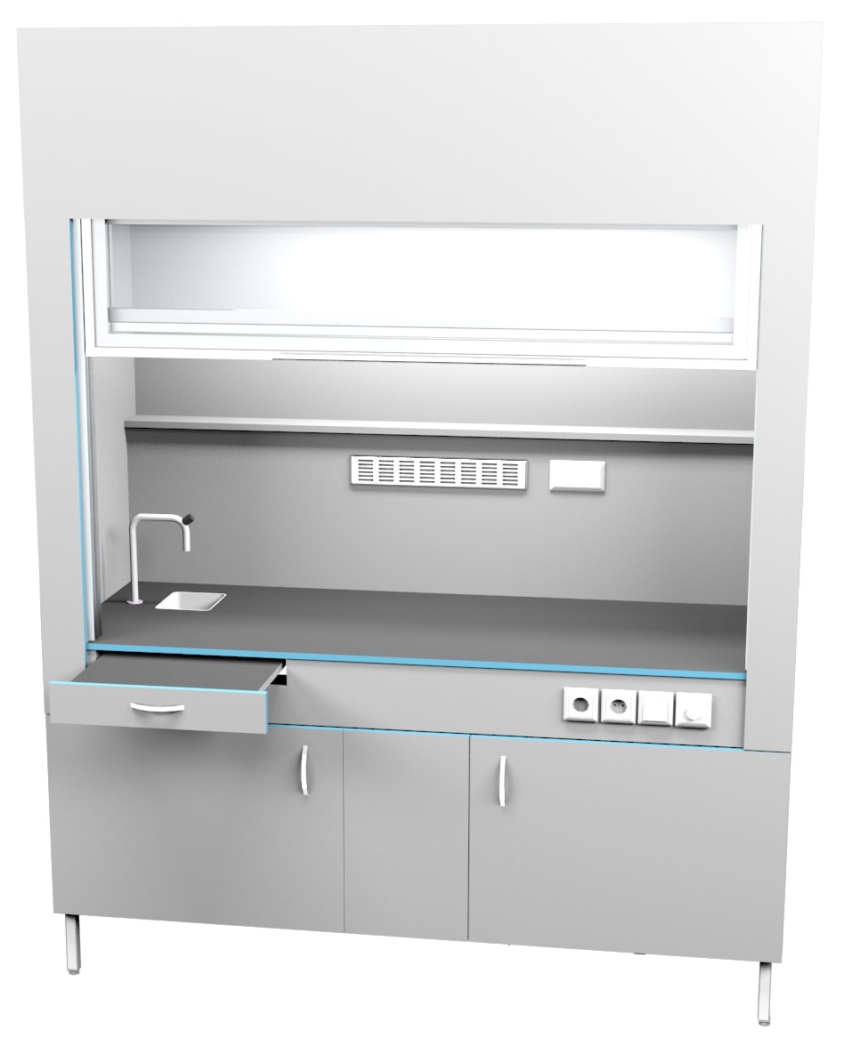 Шкаф вытяжной с сантехникой ШВ НВК 1800 КГ+ (1800×716×2200). Описание: Вытяжные лабораторные шкафы применяются при работе с токсичными и вредными летучими материалами, с чистыми материалами, с растворением или разложением под температурной обработкой, при проведении анализа проб и многих других. Особенности: Полипропиленовая раковина, обладающая высокой химической стойкостью Химически стойкий кран из латуни с полипропиленовым напылением для подключения холодной воды Дополнительная подсветка сбоку с плавной регулировкой Выдвижной столик Вытяжка из нижней тумбы позволяет хранить в ней реактивы Ударопрочный подъемный кран легко поднимается одной рукой Экран в поднятом состоянии не увеличивает высоту шкафа Внутри рабочей камеры полочка для хранения реактивов Две влагозащищенных розетки с крышкой внутри рабочей камеры Специальные доводчики в тумбе позволяют закрывать тумбу бесшумно По заказу столешницы могут быть выполнены из: химстойкого пластика керамогранита (плитка) полипропилена нержавеющей стали монолитной керамики эпоксидного керамзита