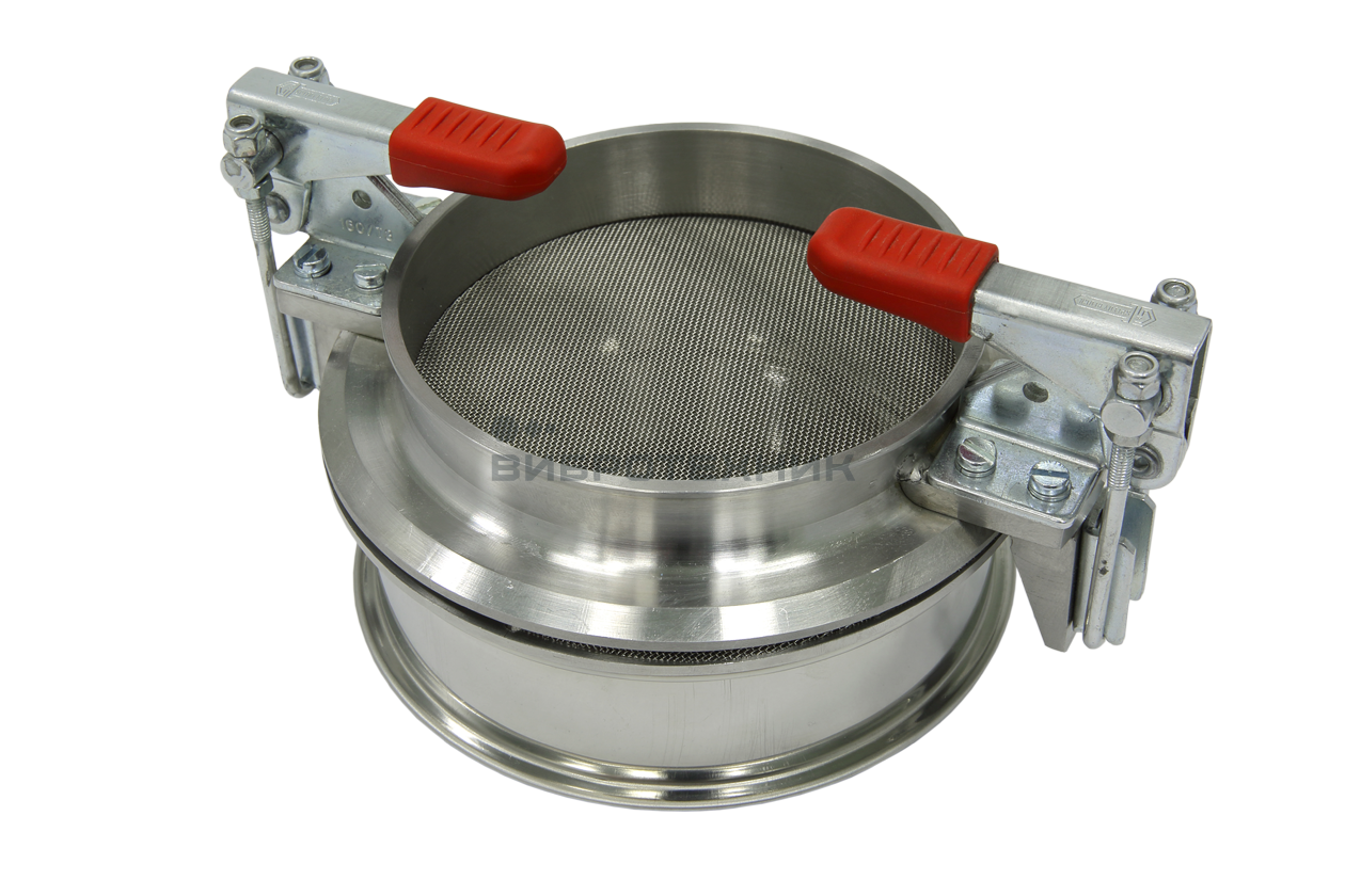 Сито лабораторное С 12 Р состоит из верхнего и нижнего фланцев, двух латчеров, просеивающего элемента и уплотнения.