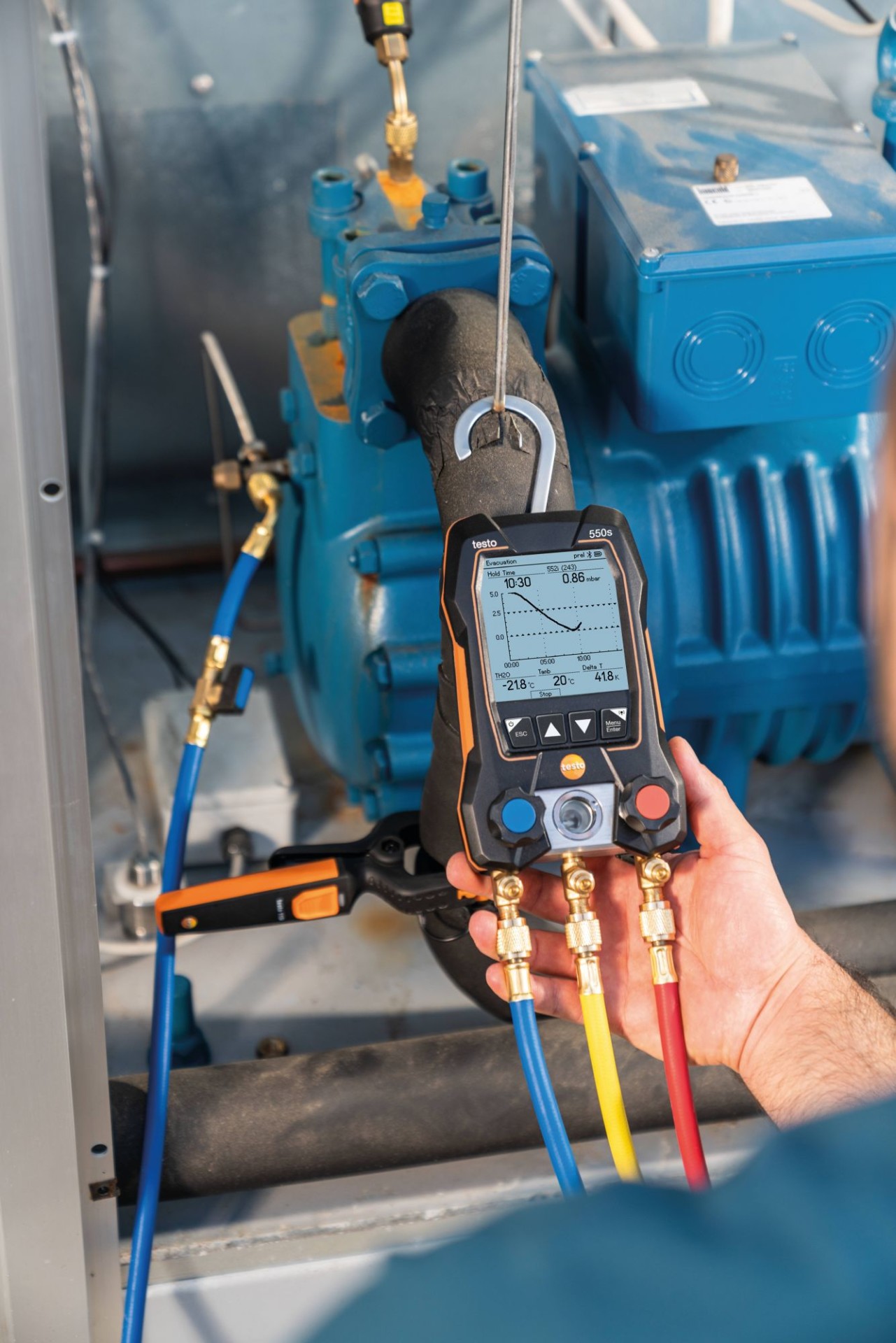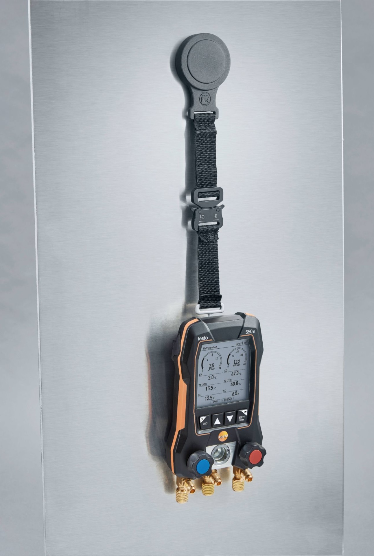С этим комплектом вы будете сразу готовы к измерениям, необходимым для пусконаладки, сервисного и технического обслуживания холодильных систем, систем кондиционирования и тепловых насосов: в комплект входят цифровой манометрический коллектор testo 550s с 2-х ходовым блоком клапанов и Bluetooth, два зонда-зажима для труб (NTC) с фиксированным кабелем и прочный кейс для транспортировки. Дополнительные Bluetooth-зонды, например, для измерения температуры и вакуума можно заказать отдельно.
