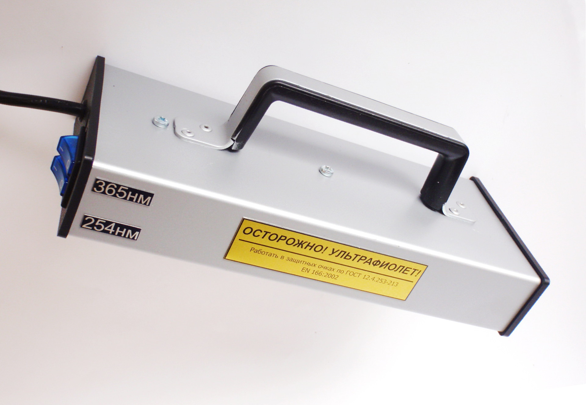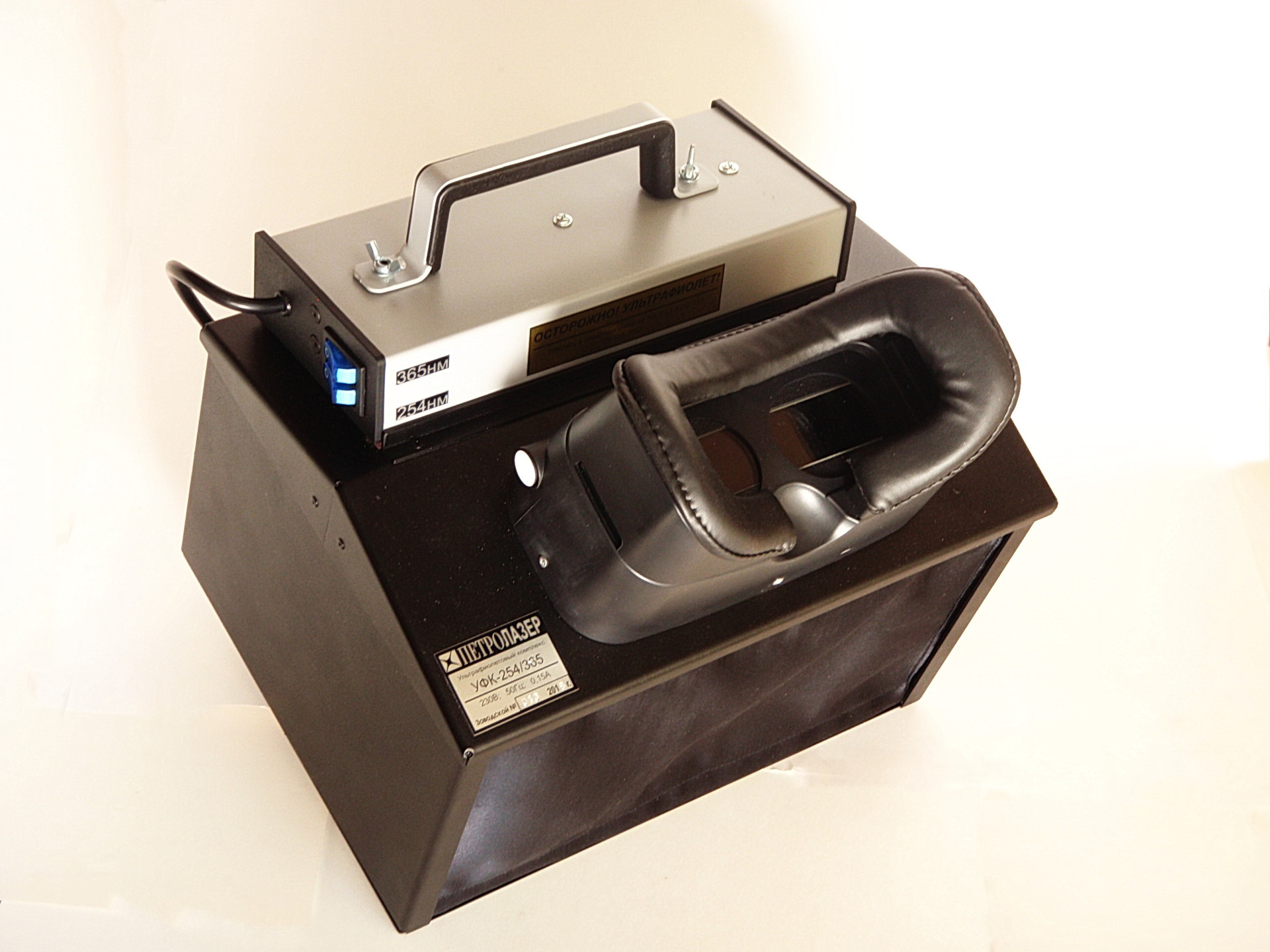 Безопасность обеспечивается используемым защитным УФ-фильтром, который установлен перед окуляром. Также на корпусе расположен порт для установки съемного УФ-осветителя. Осветитель УФО 254\365 может использоваться как самостоятельное изделие. УФ-осветитель к аналитическому кабинету снабжен специальными мощными светодиодами и спектрально-селективными фильтрами (увиолевое стекло). Такая конструкция и оптическая схема позволяют добиться отсутствия мешающего видимого излучения и повысить контрастность и обнаружительную способность при исследовании.