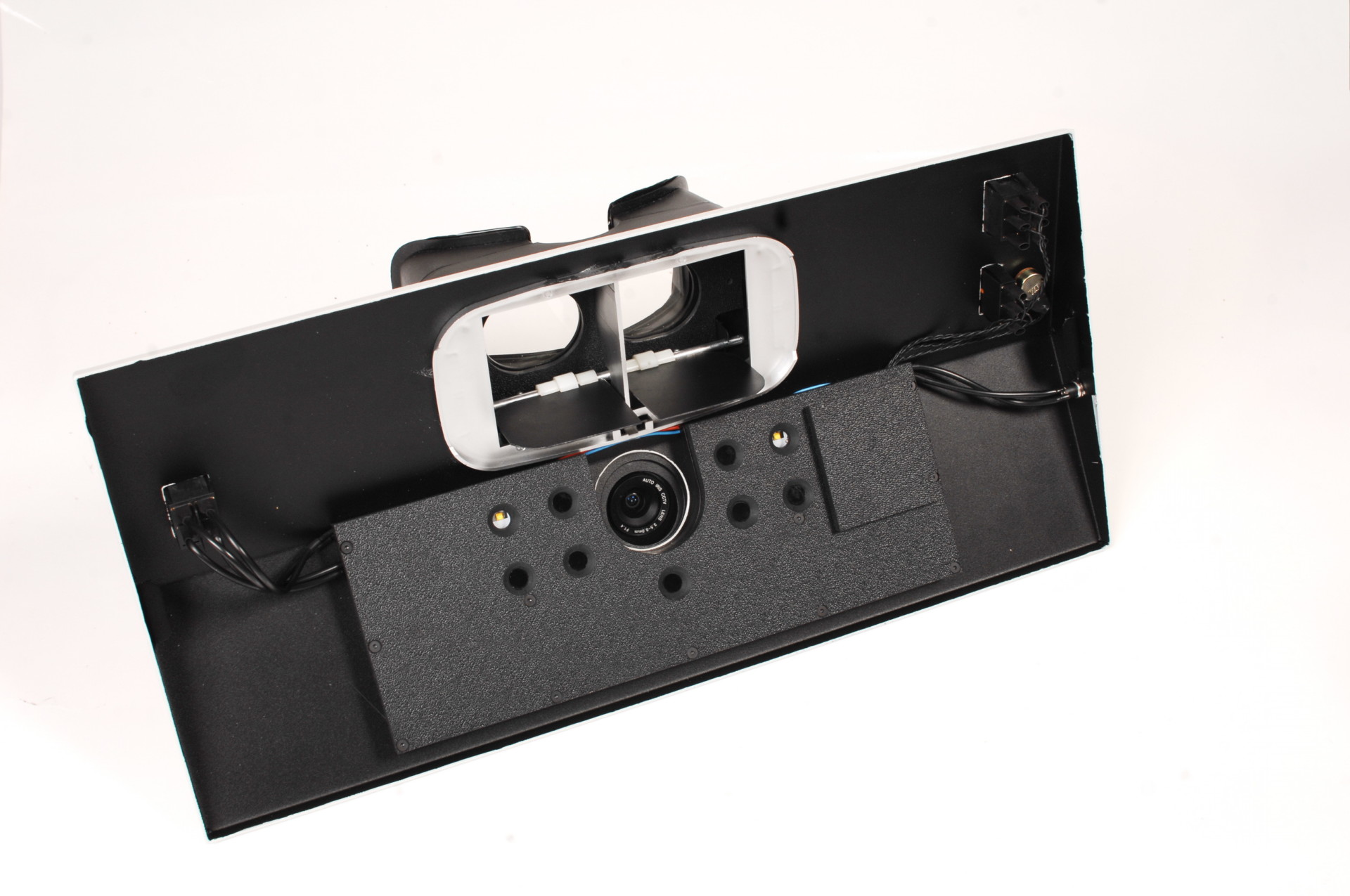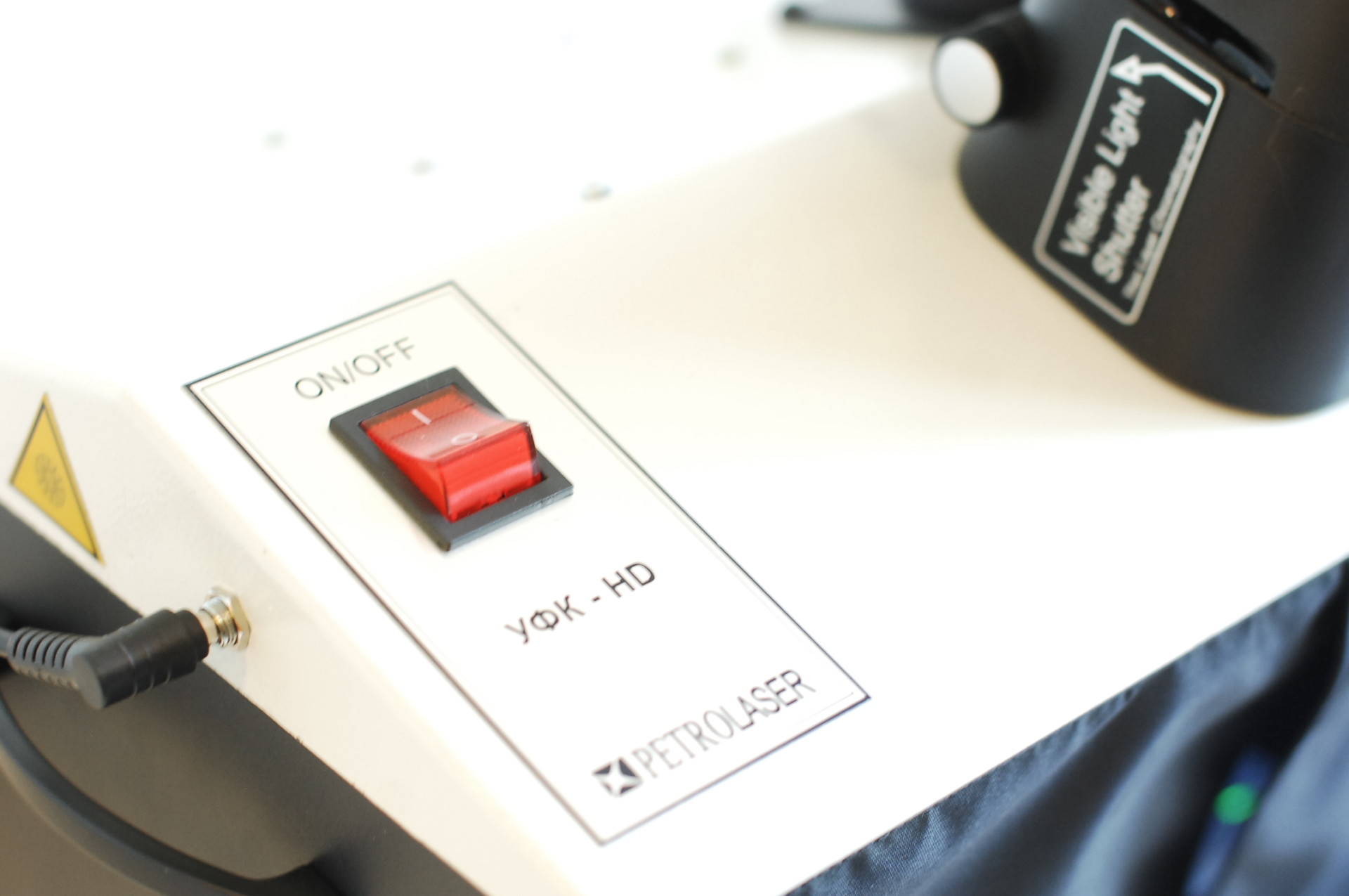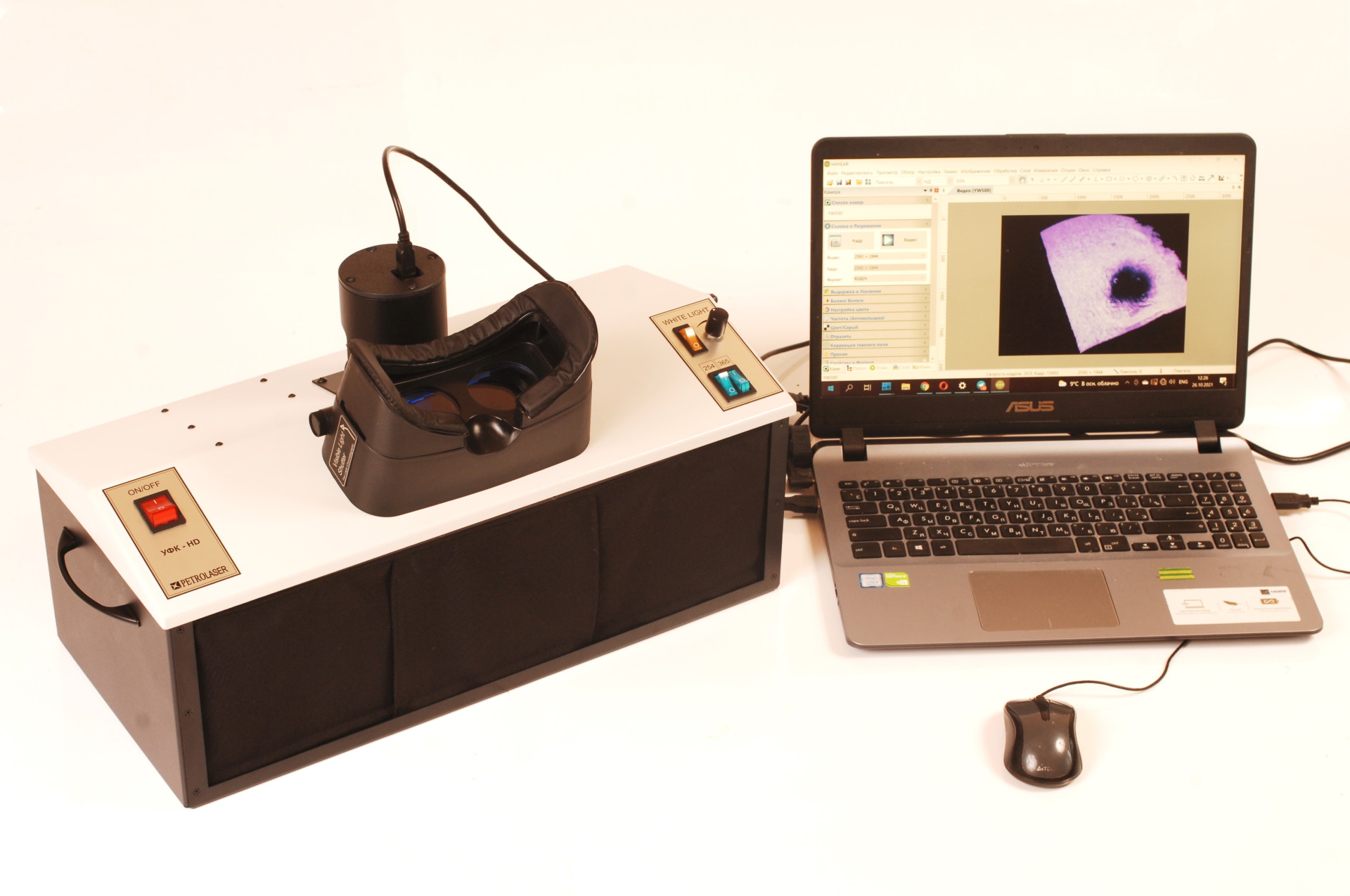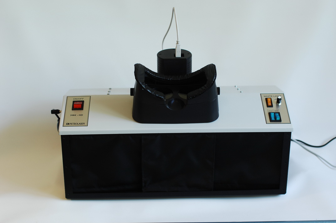 Безопасность зрения лаборанта обеспечивается как используемым защитным УФ-фильтром, который установлен перед окуляром, так и гораздо более редкой необходимостью наблюдать образец визуально: его прекрасно видно на экране дисплея или компьютерного монитора. УФ-осветитель к аналитическому кабинету снабжен специальными светоизлучающими диодами мощностью 20 Вт (365 нм) + 15 Вт (254 нм) и спектрально-селективными фильтрами (увиолевое стекло). Такая конструкция и оптическая схема позволяют добиться отсутствия мешающего видимого излучения и повысить контрастность и обнаружительную способность при исследовании.
