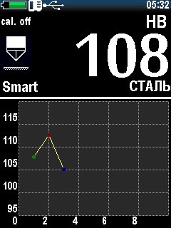 — большой цветной графический дисплей. Помимо имеющихся 88 комбинаций шкал твердости и материалов (калибровок), прибор дает возможность дополнительно настроить пользовательские шкалы и материалы. Информацию можно отобразить в виде гистограмм, графиков, таблиц, есть интеллектуальный режим, отображение отклонения, среднего, большое количество другой статистической информации; — прибор позволяет хранить и просматривать архив измерений, сохранять на карту памяти калибровки;