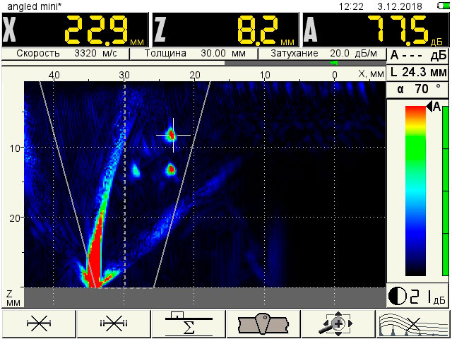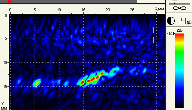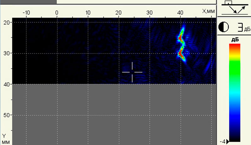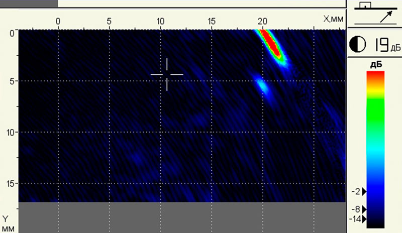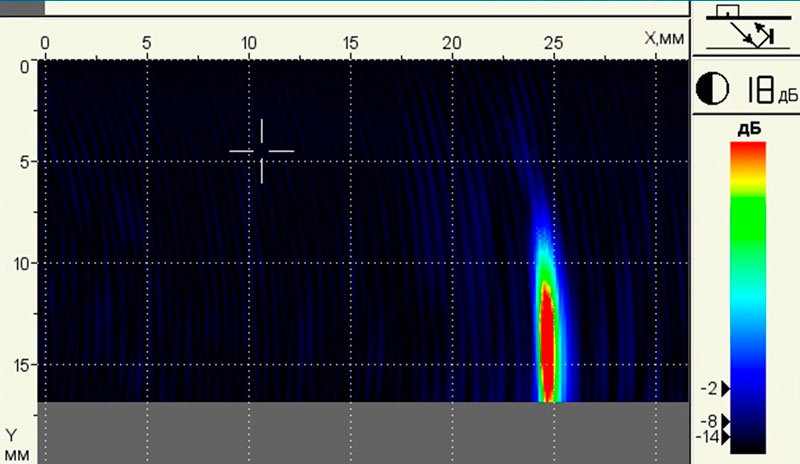 • Отображение образов объемных (поры) и вертикально ориентированных (трещины) дефектов благодаря специальным режимам.