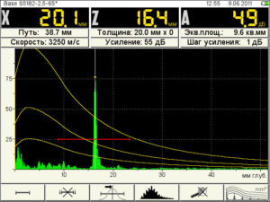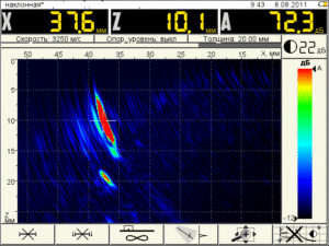 После обнаружения дефектов обеспечивается возможность оценки их реальных или эквивалентных размеров следующими методами: классическим (сравнение с амплитудой сигнала от контрольного отражателя) и дефектометрическим (измерением координат характерных точек образа дефекта и расстояний между ними непосредственно по реконструируемому изображению).